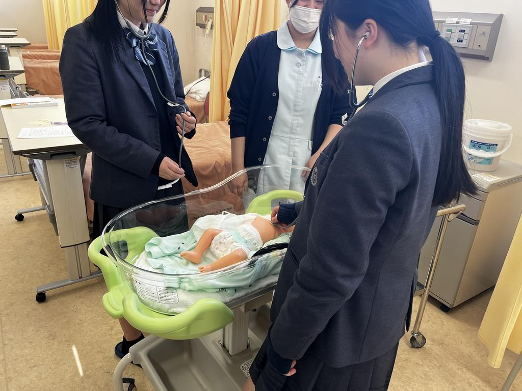 シミュレーター(模擬患者)で、在校生と一緒に聴診器を使って心臓や呼吸の音を聞いてみました。