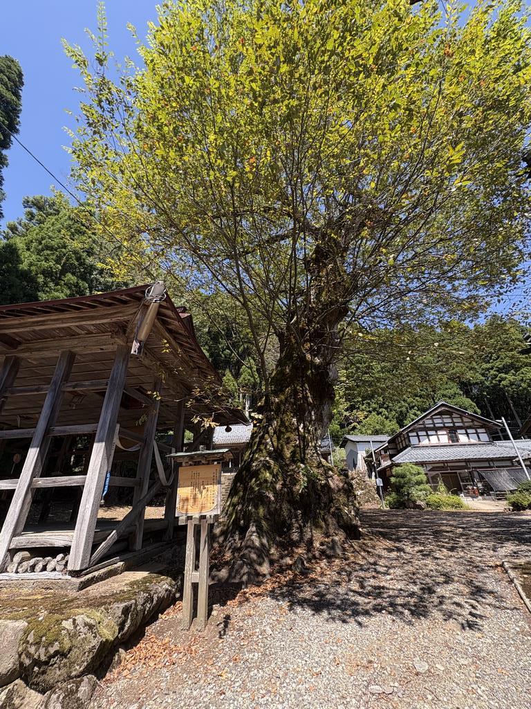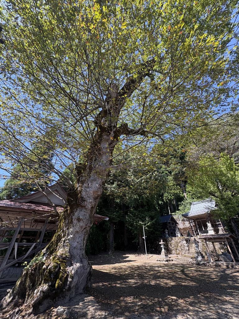 池田町山田地区の集落にある八幡神社には「山田の大ケヤキ」と呼ばれる巨木が立っています。樹高約35m、幹周り約6m、樹齢は800年近いといわれており、池田町の天然記念物に指定されています。斜めに伸びた幹の根元一面にある大小無数のこぶや苔に覆われた様子は、長い年月を生き抜いてきた風格を漂わせています。