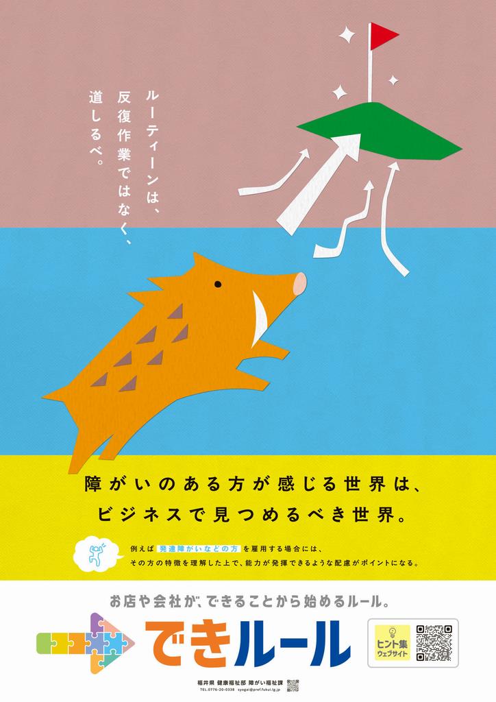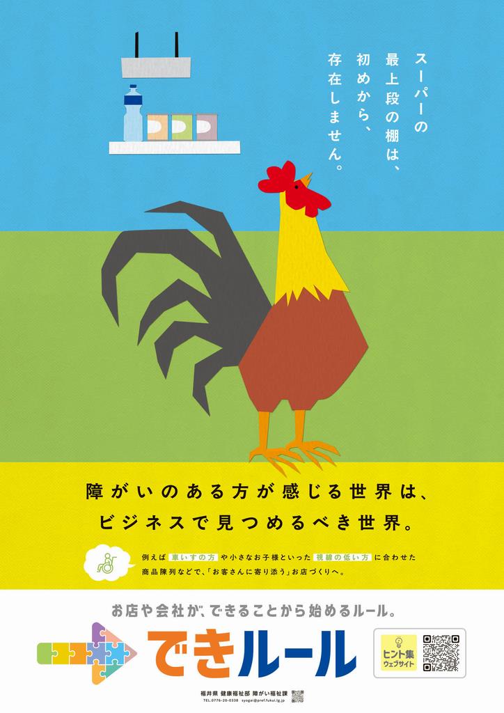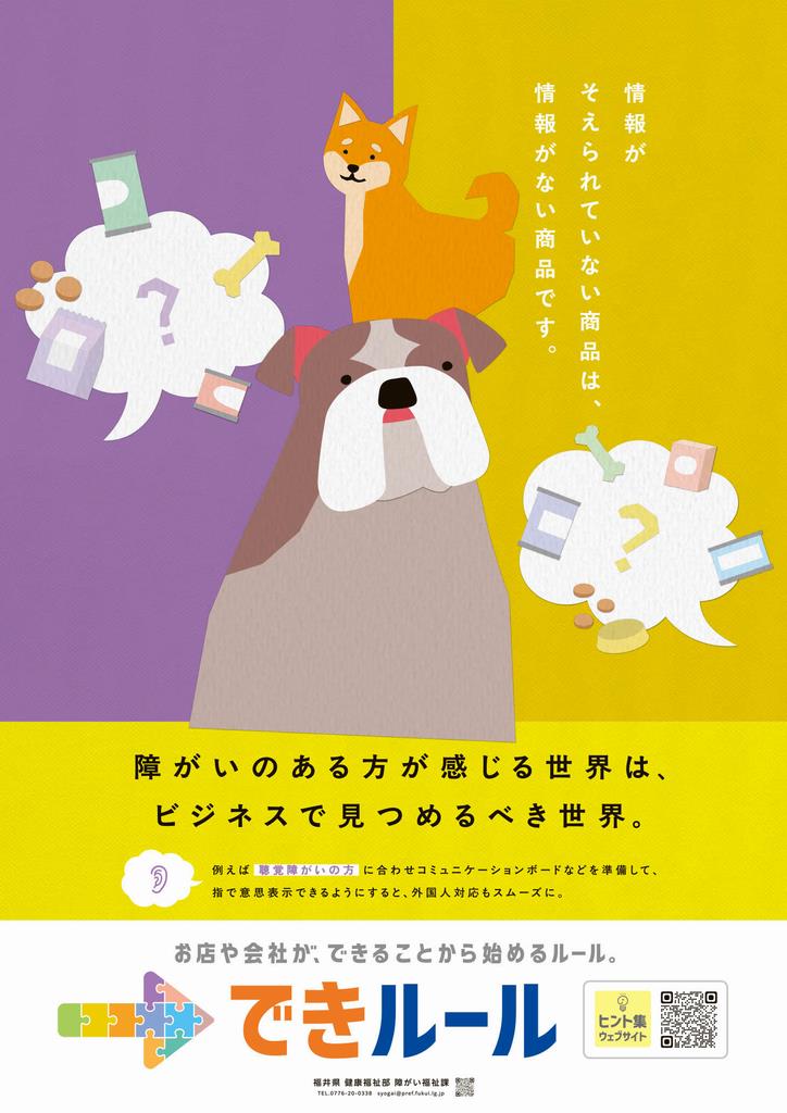 令和6年4月に改正障害者差別解消法が施行され、事業者による障がいのある人への合理的配慮の提供が義務化されました。福井県では、「合理的配慮の提供」について、障がいのある人と事業者との対話の中で、それぞれの会社やお店等において”できることから始める” ”まず第一歩を始めていく” ルールを、「できルール」という言葉で広めています。